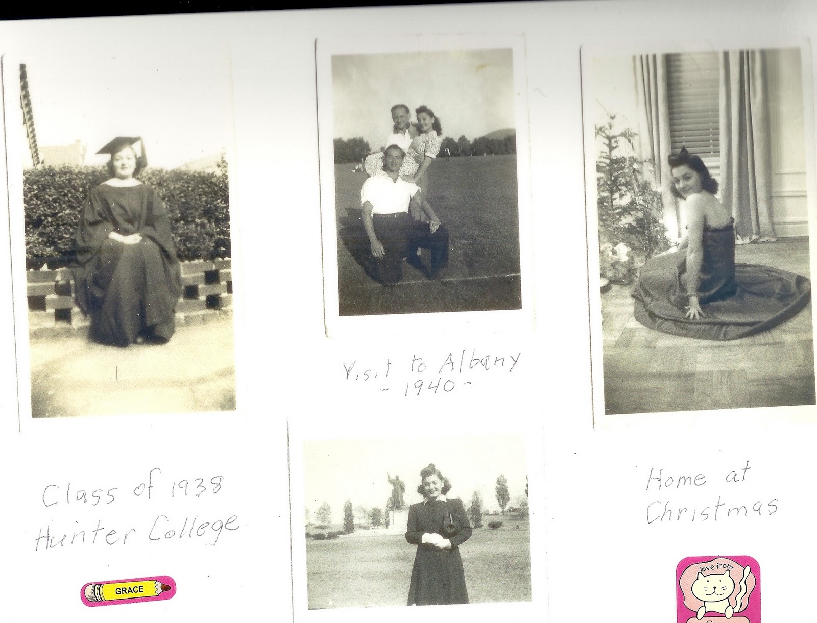 What I do have is a page from my other grandmother's photobook. I was going to cut out the photos and paste them but I love my grandmother's handwriting and stickers. My grandmother is in the middle two and right photos. Her friend, Grace (as listed) is on the left. Don't you just love old photos that capture moments of your loved ones before you knew them. Makes me want to turn back time and be a fly on the wall. Like who are these boys she was hanging out with in Albany? And what color what that dress on the right? I do know that my great-grandmother made all of my grandmother's clothes...even her wedding dress, which will be featured in a future post.